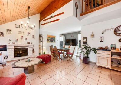 Le niveau principal dispose d'une cuisine ouverte sur un grand séjour avec cheminée - un espace chaleureux et convivial donnant accès à une large terrasse, idéale pour profiter pleinement des beaux jours. Vous y trouverez également une chambre-bureau et un WC visiteurs.
